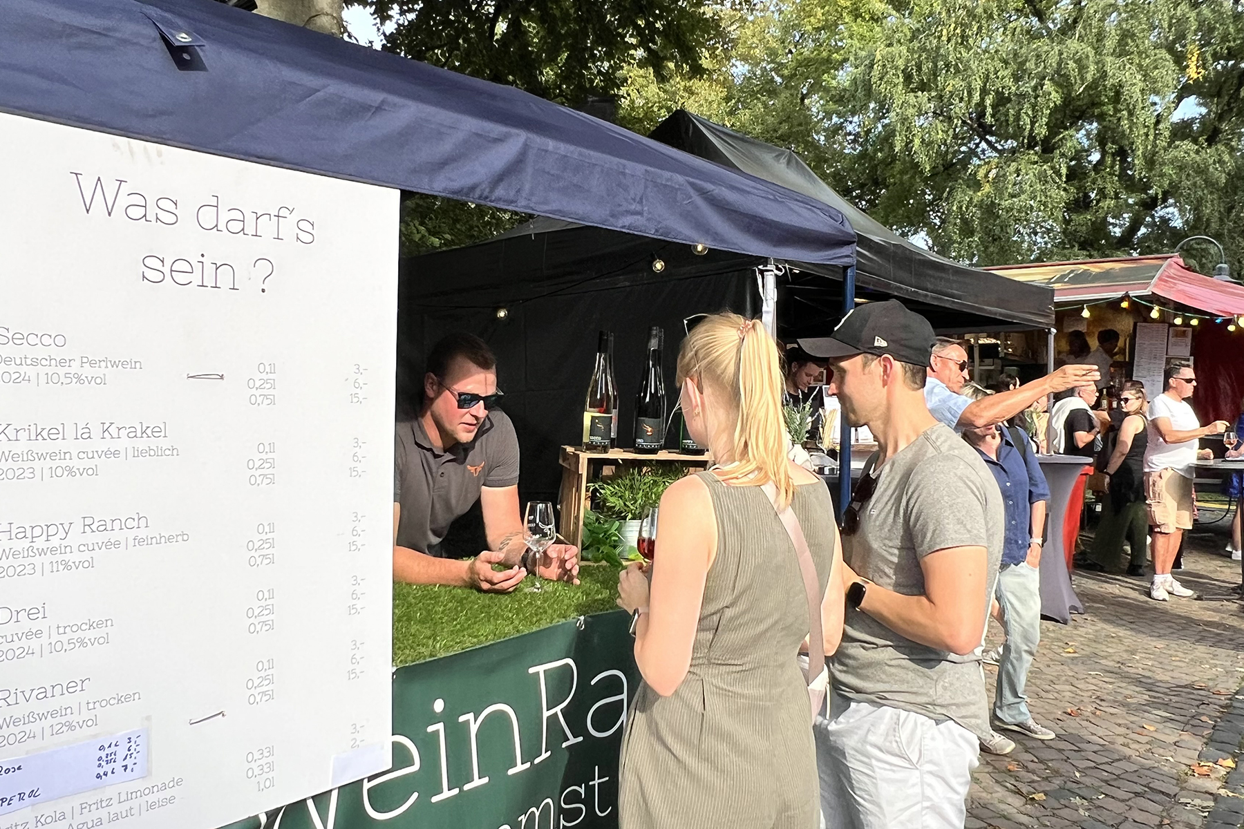 Beim 1. Weinfest präsentierten sieben ausgewählte Winzer und Weinanbieter kräftige „Rote“, leichte „Weiße“ und spritzige „Rosé`s“. Darunter das Weingut Knell aus Hessen, die WeinRanch aus der Wedemark, Weinhändler Ludwig von Kapff, Müsken Weine aus der Wedemark, Jaques Weindepot und „Le Sommelier“ aus Isernhagen-Süd. Die weiteste Anreise hatte die Vinothek Worms, ein Zusammenschluss aus 13 dortigen Winzern.
