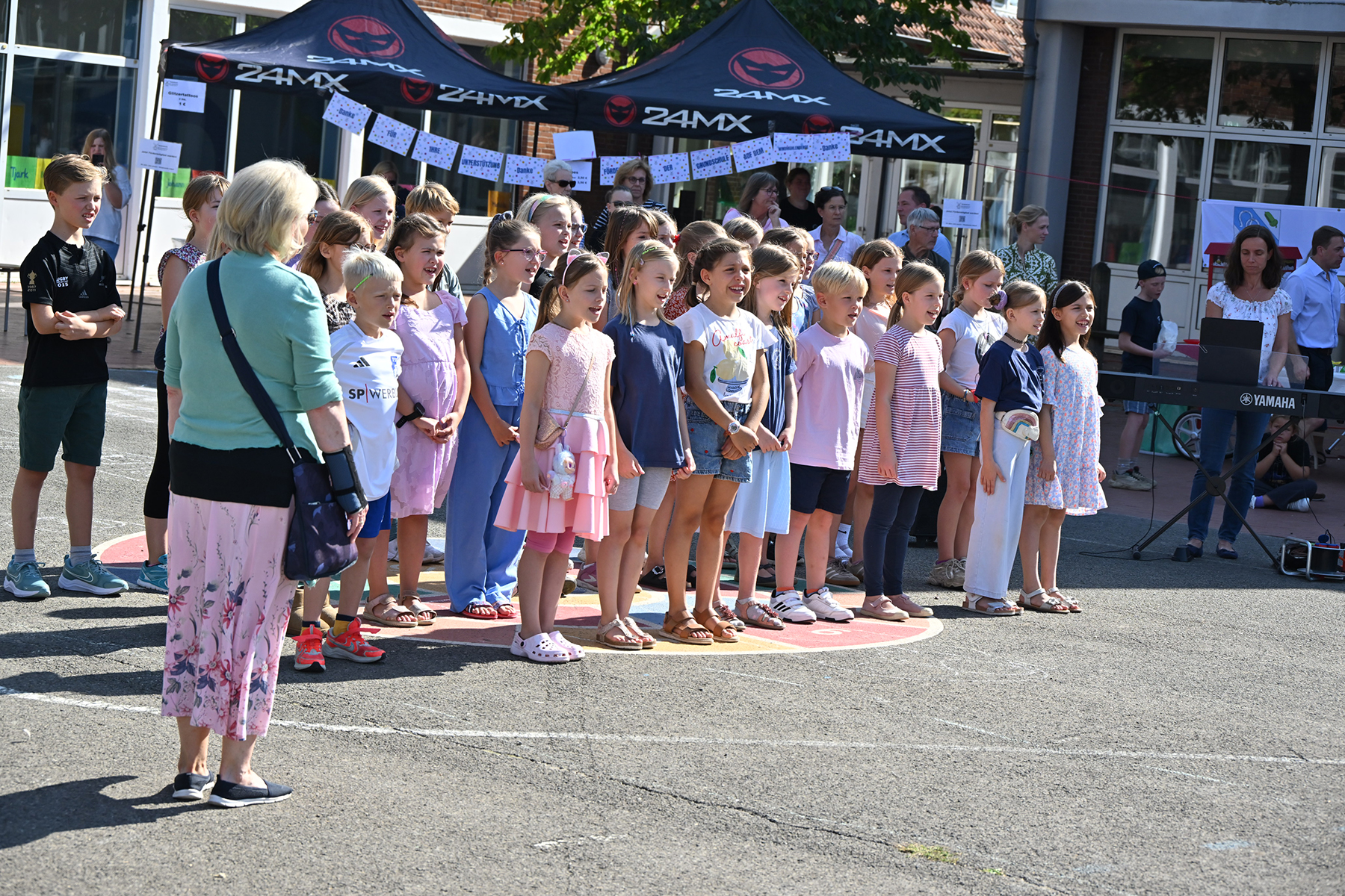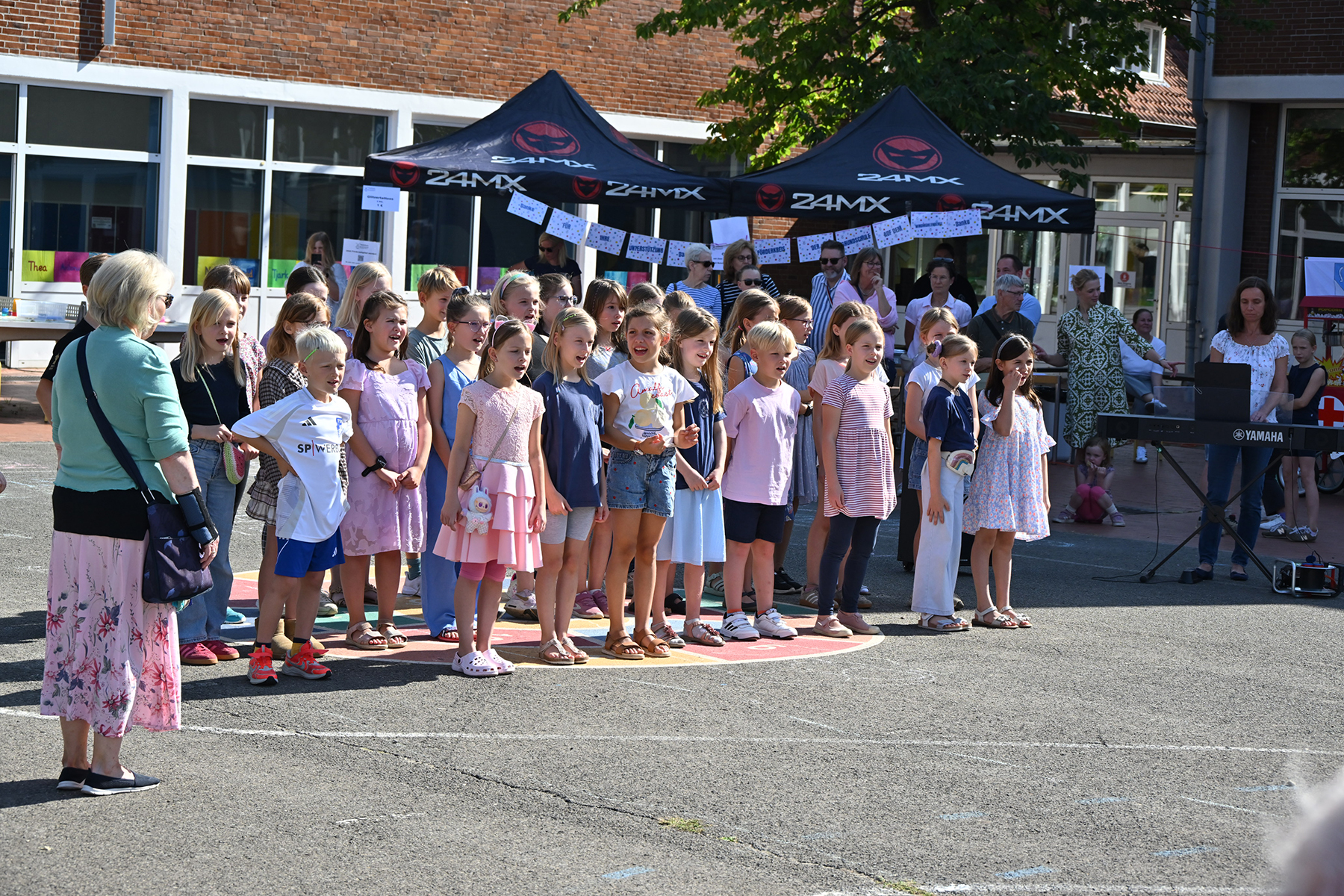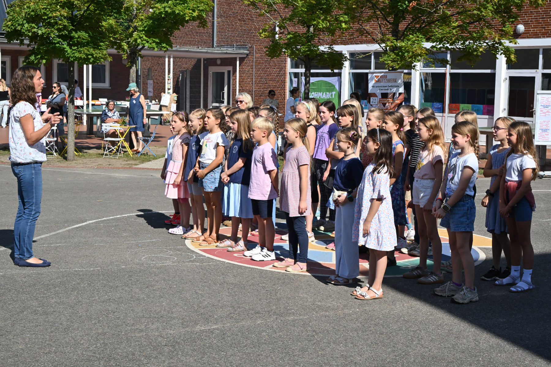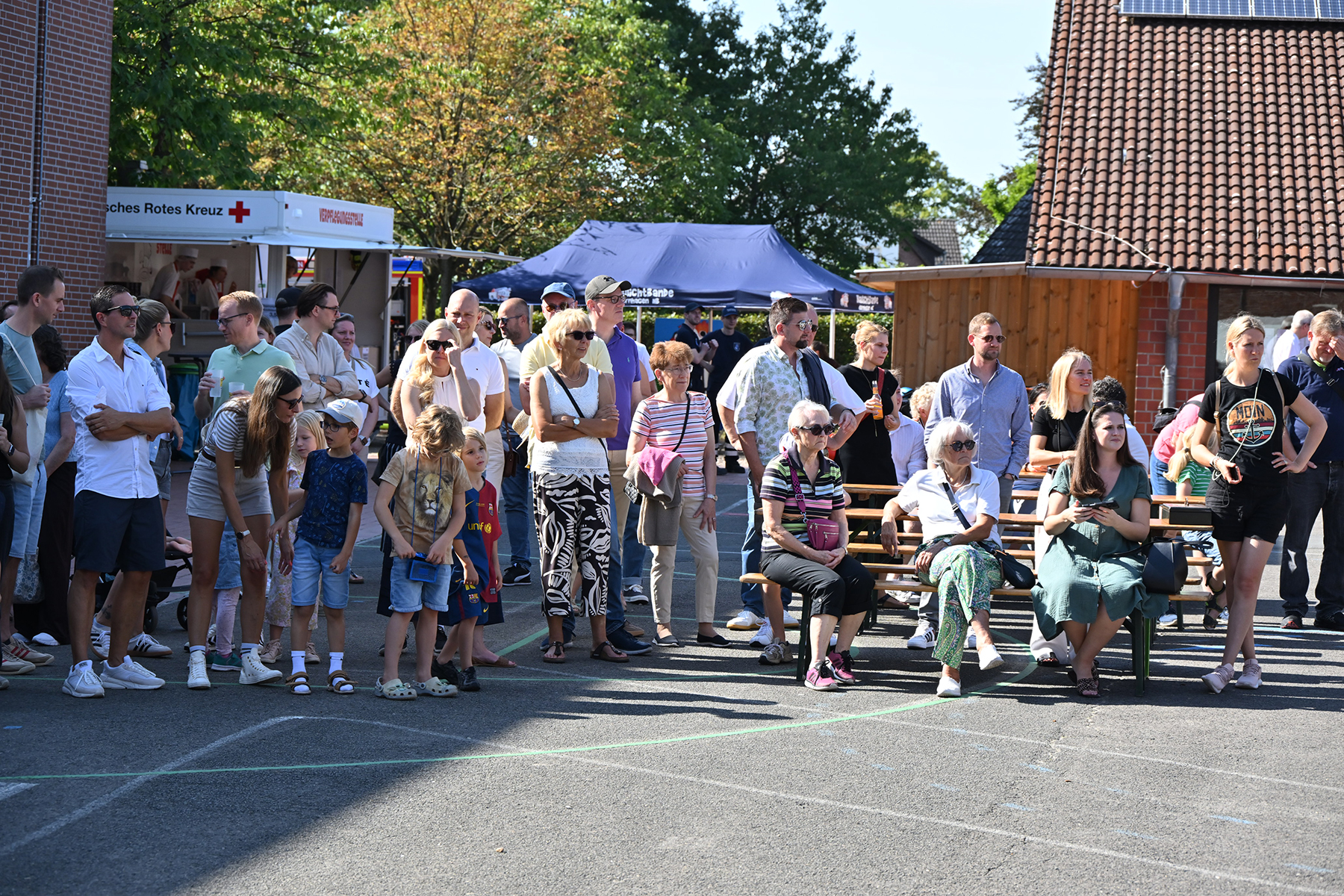 Den Auftakt der Auftritte machte der Schulchor unter der Leitung von Mareike Hußmann. Die 35 Kinder boten drei Lieder, darunter eigens ein Lied für das Dorffest, mit dem Refrain “Große und kleine Leute, kommt doch zu uns heran, wir feiern zusammen heute, unser Dorffest fängt gut an.” Mit strahlenden Augen verließen die Dritt- und Viertklässler unter großem Applaus von Eltern, Großeltern, Onkeln, Tanten und Verwandten die Bühne.