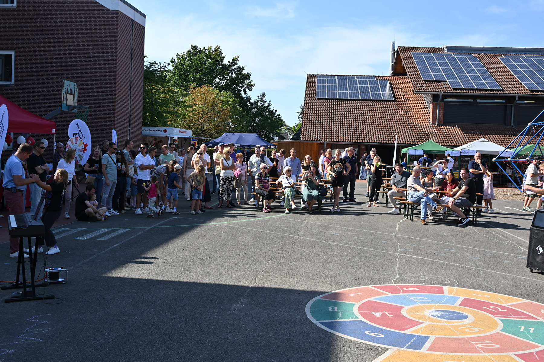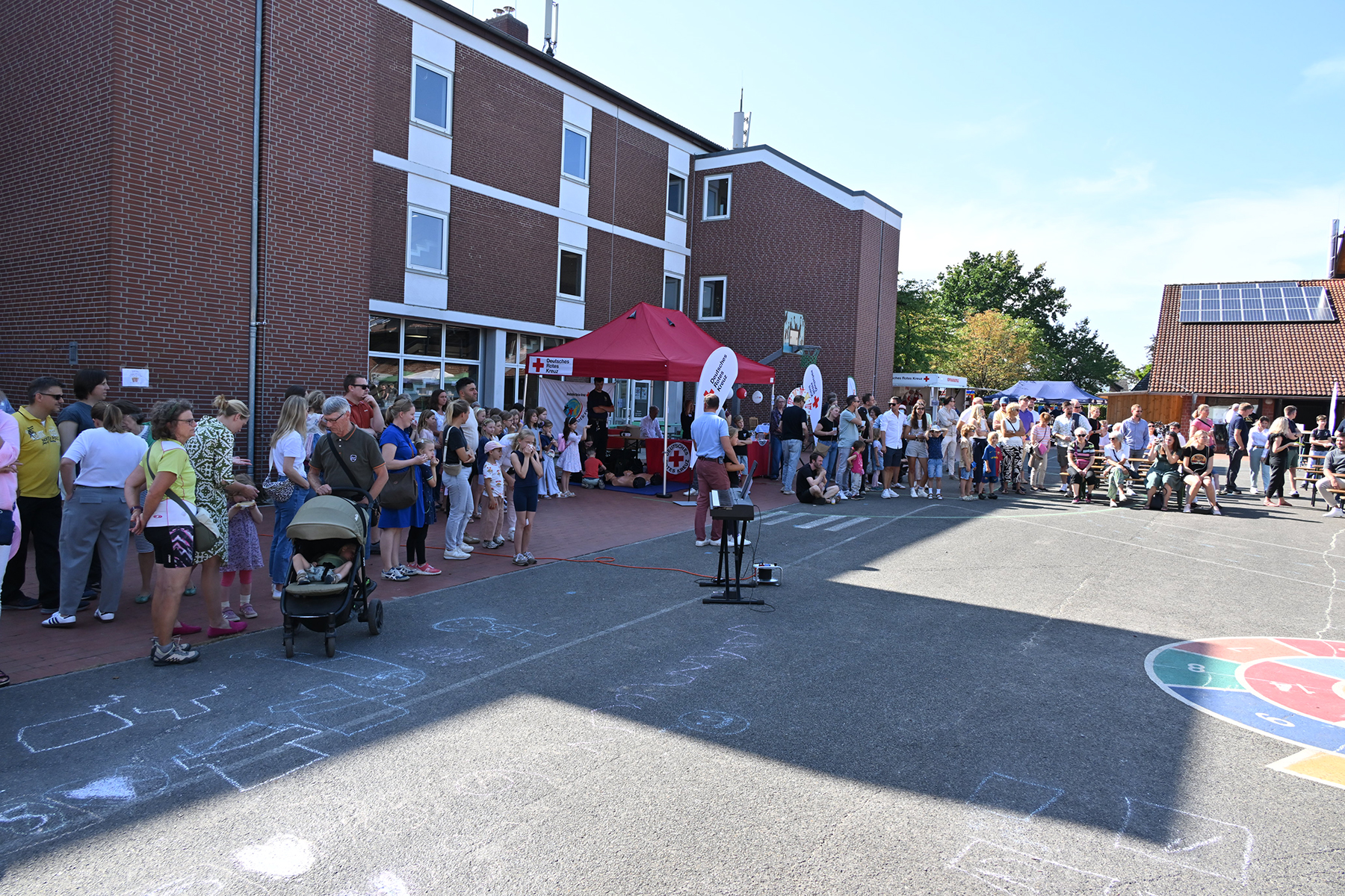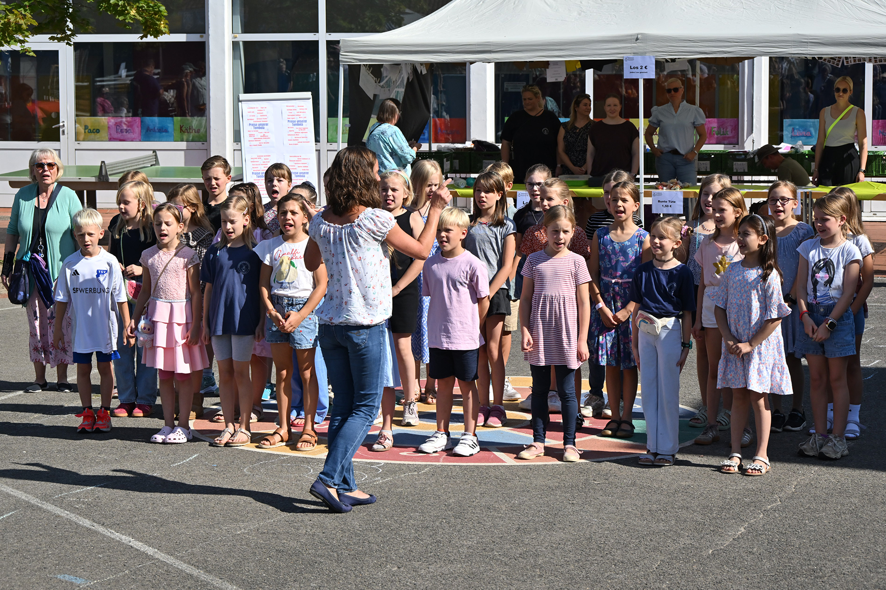 Den Auftakt der Auftritte machte der Schulchor unter der Leitung von Mareike Hußmann. Die 35 Kinder boten drei Lieder, darunter eigens ein Lied für das Dorffest, mit dem Refrain “Große und kleine Leute, kommt doch zu uns heran, wir feiern zusammen heute, unser Dorffest fängt gut an.” Mit strahlenden Augen verließen die Dritt- und Viertklässler unter großem Applaus von Eltern, Großeltern, Onkeln, Tanten und Verwandten die Bühne.