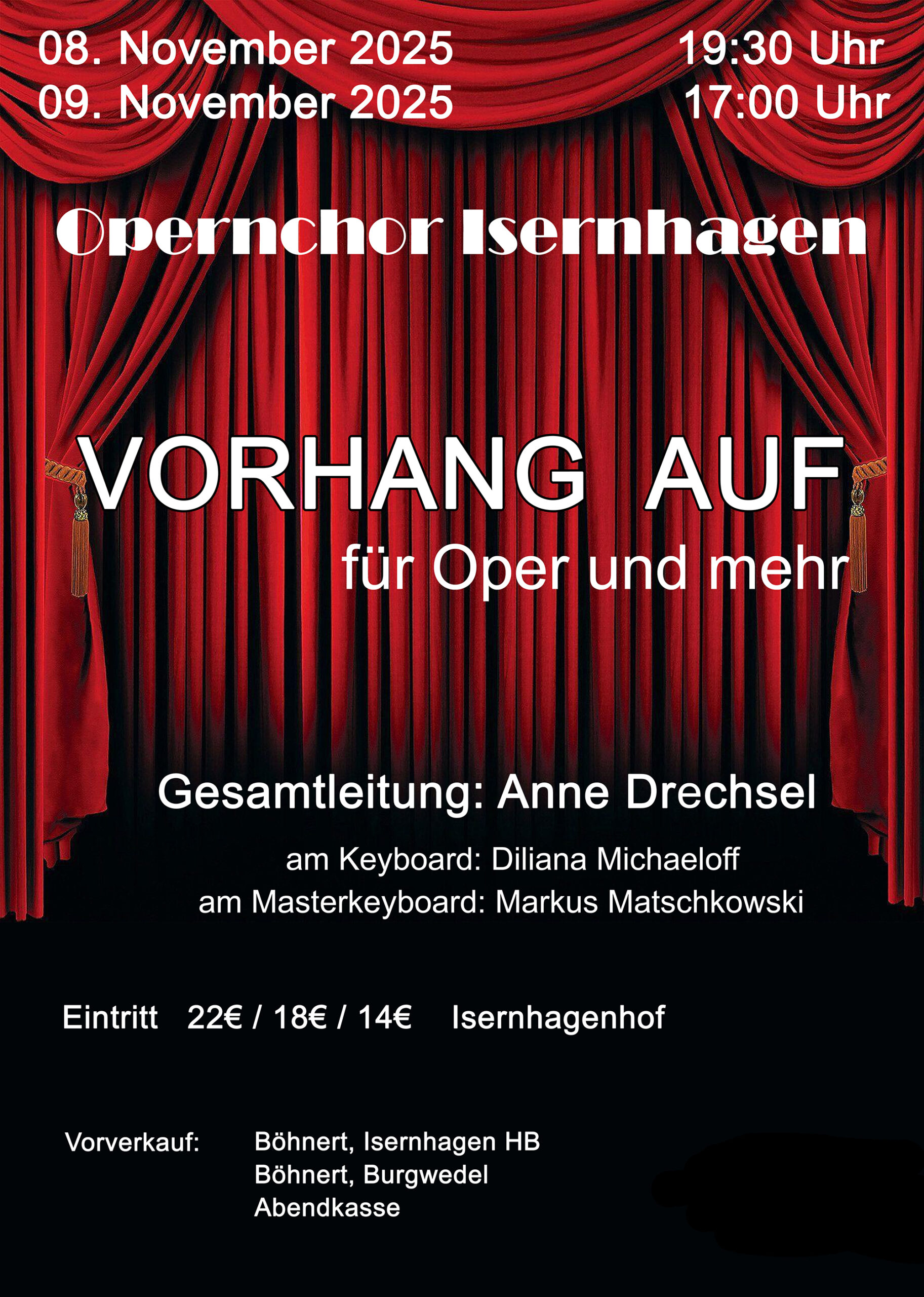 Bereits zum vierten Mal heißt es im Isernhagenhof „Vorhang auf – für Oper und mehr“. Die beliebten Opernchorkonzerte unter der Leitung von Anne Drechsel sind längst zu einer festen Tradition geworden. Nach drei ausverkauften Spielzeiten kehrt der Opernchor am Samstag, 8. November 2025, um 19.30 Uhr, und am Sonntag, 9. November 2025, um 17 Uhr, mit einem neuen, schwungvollen Programm auf die Bühne zurück.
