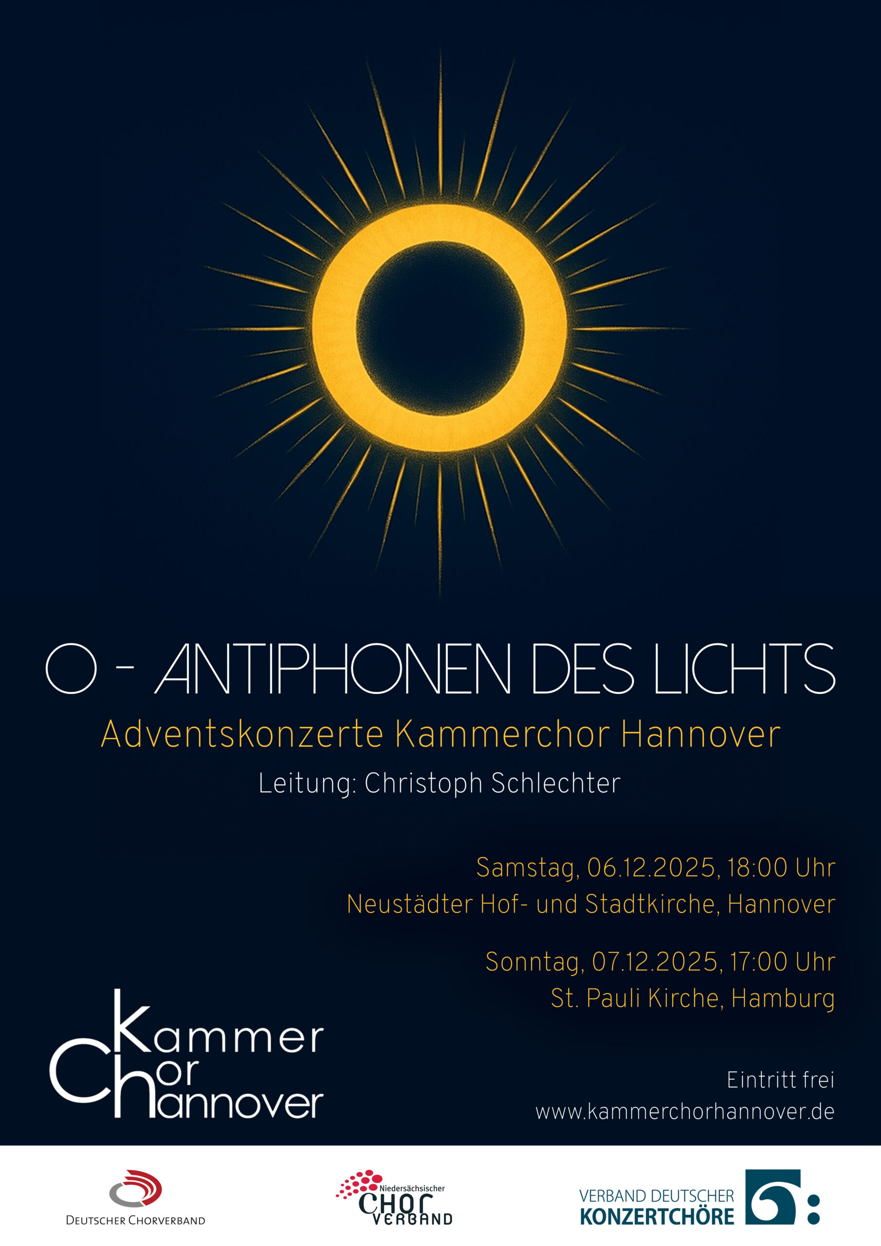 Der Kammerchor Hannover gestaltet in diesem Jahr seine Adventskonzerte unter dem Titel „O – Antiphonen des Lichts“. Am Sonnabend, 6. Dezember 2025, um 18 Uhr findet das Konzert in der Neustädter Hof- und Stadtkirche in Hannover statt. Der Eintritt ist frei.