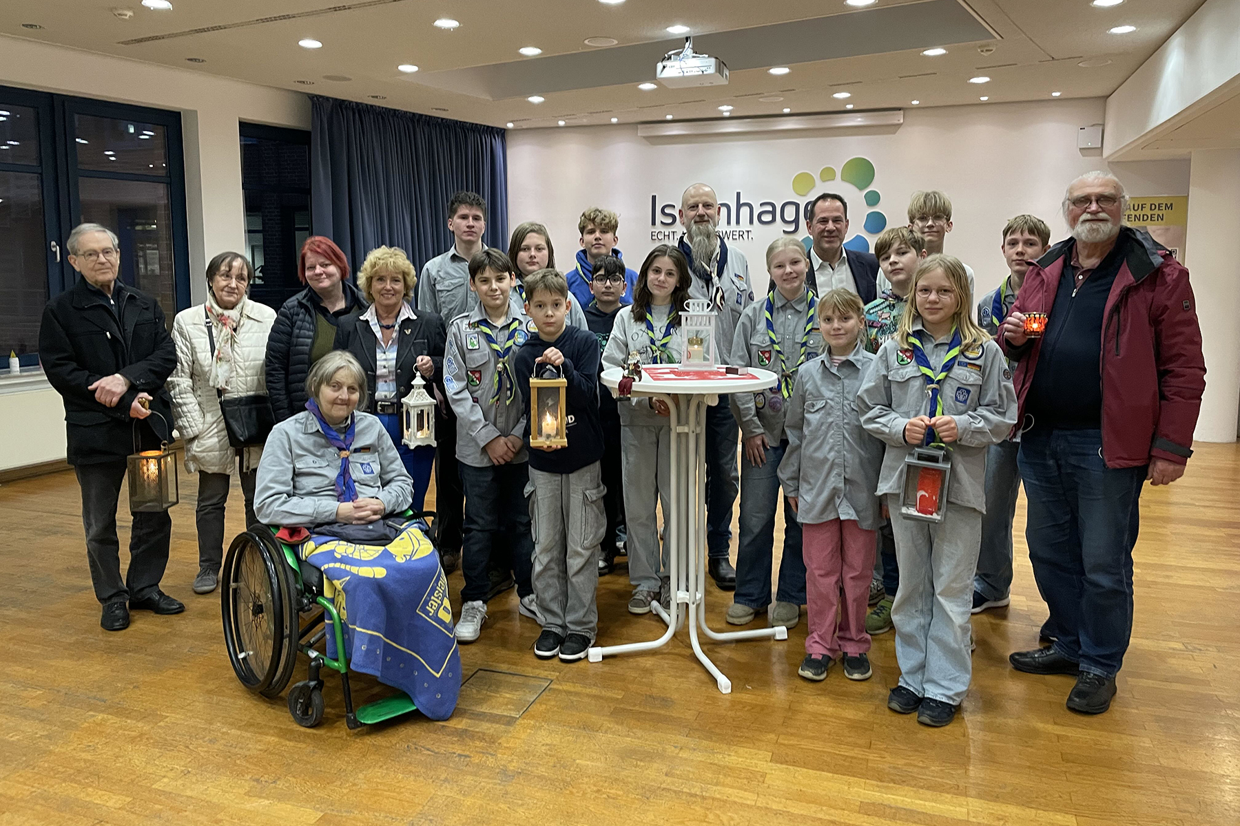 Isernhagens Gemeindebürgermeister Tim Mithöfer hat gemeinsam mit Bürgern im Rathaus in Altwarmbüchen die Flamme des Friedenslichts aus Bethlehem entgegengenommen. Die Pfadfindergruppe der evangelisch-lutherischen Christophorus-Kirchengemeinde brachte das Licht in einer Laterne mit, eine zweite Laterne diente der Absicherung des Transports.