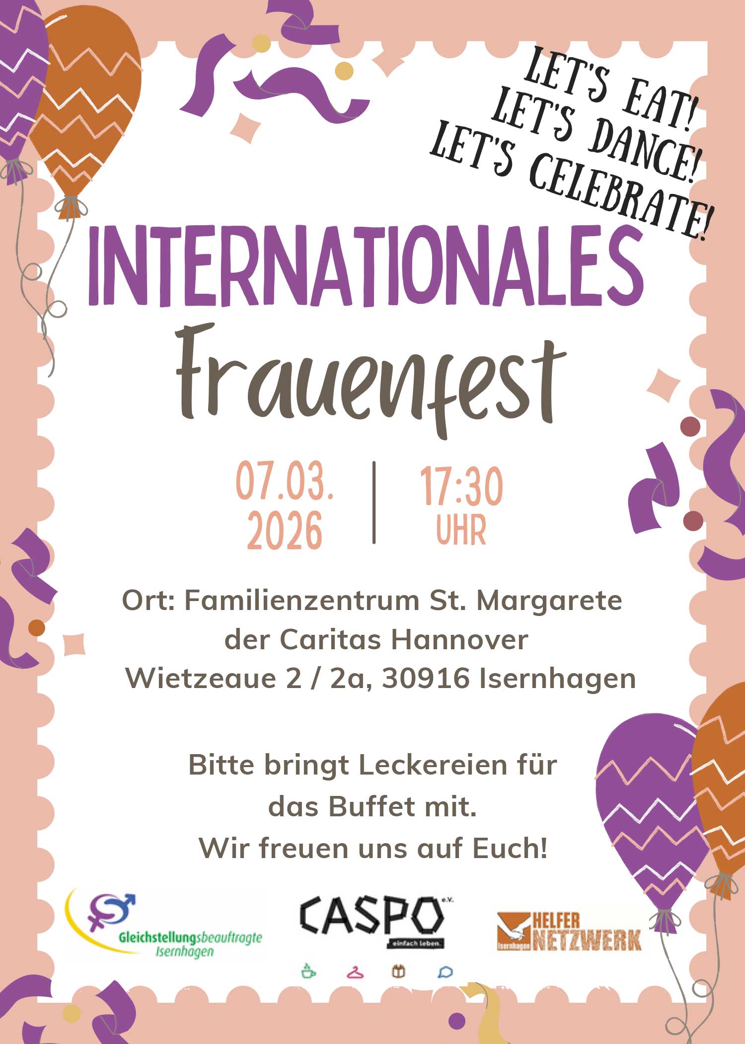 Das Fest findet am Sonnabend, 7. März, ab 17:30 Uhr im Familienzentrum St. Margarete der Caritas Hannover, Wietzeaue 2/2a in Altwarmbüchen, statt. Veranstalter sind Caspo, das Helfernetzwerk Isernhagen und die Gleichstellungsbeauftragte der Gemeinde Isernhagen.