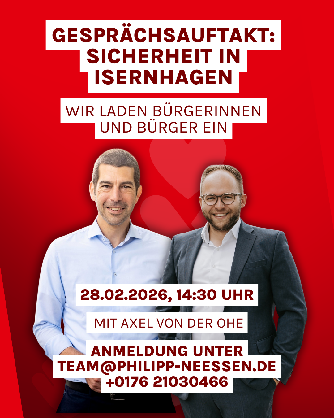 Der Partei- und Fraktionsvorsitzende der SPD Isernhagen sowie Bürgermeisterkandidat Philipp Neessen lädt daher am Freitag, 28. Februar 2026, um 14:30 Uhr zu einem öffentlichen Gespräch in die Begegnungsstätte, An der Riehe 21 in Altwarmbüchen, ein.