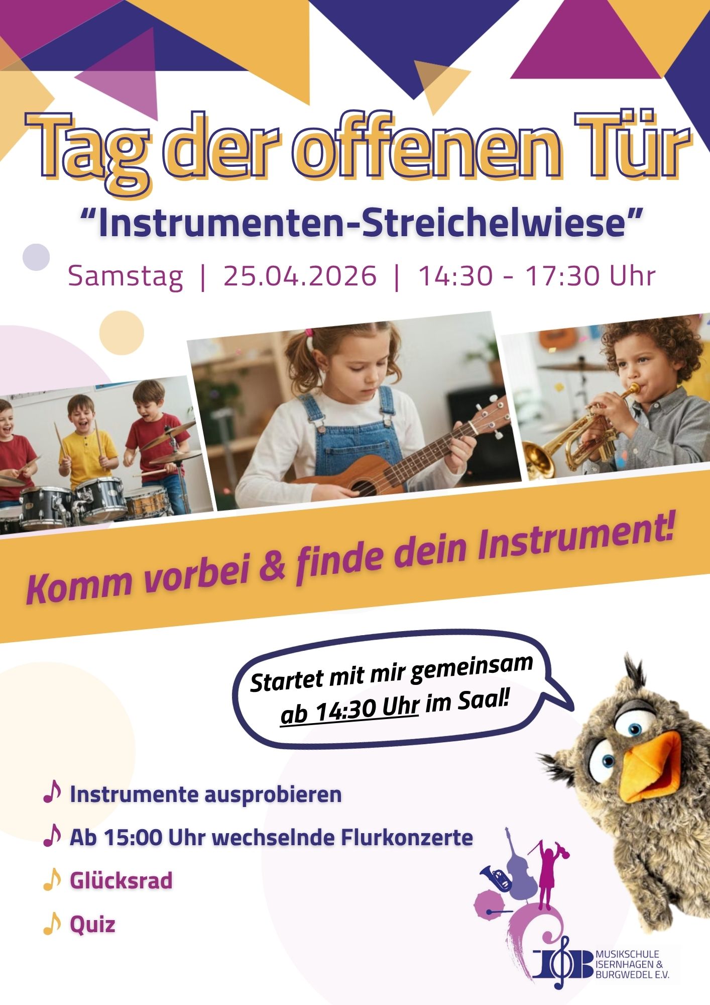 Die Musikschule Isernhagen und Burgwedel öffnet am kommenden Sonnabend, 25. April 2026, von 14.30 bis 17.30 Uhr ihre Türen in der Hauptstraße 68 in Isernhagen F.B. und lädt unter dem Motto „Instrumenten-Streichelwiese“ zu einem musikalischen Mitmach-Nachmittag ein.
